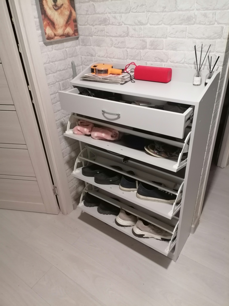 Хочется, чтобы обувь всегда была аккуратно расставлена и не занимала много места. У каждого из членов нашей семьи есть несколько пар. Поэтому в нашей небольшой прихожей мы решили найти место для их хранения. Нашим выбором стала галошница 3.1, так как она очень вместительная и в верхней её части есть дополнительное полезное пространство. По ширине она как раз поместилась в прихожей нашей квартиры. Теперь у каждого есть свое место под обувь!