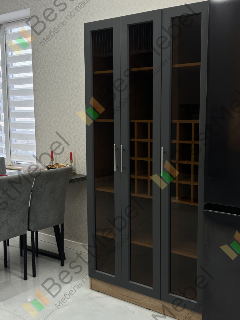 Шкаф Буффало 1 BMS представляет собой элегантную витрину с корпусом в крафтовых древесных тонах и черным рамочным фасадом. Трехдверная модель с просторными прямыми полками и квадратными ячейками предназначена для размещения винной коллекции, обеспечивая содержимому прекрасный обзор. Встроенная подсветка помогает эффектно представить бутылки с винами и придает помещению уютный и атмосферный вид. Купить шкаф Буффало 1 BMS приглашаем в наш интернет-магазин.