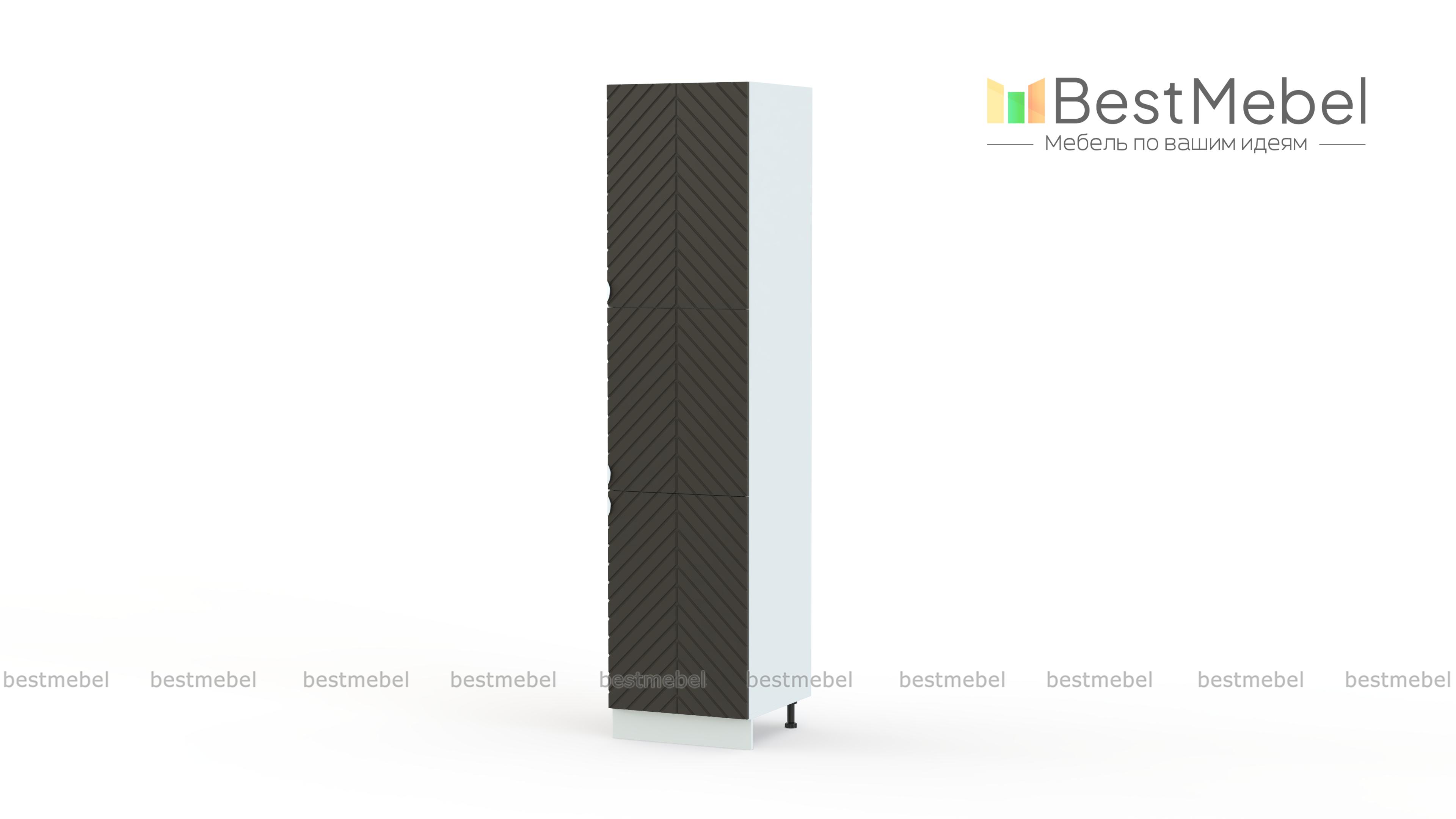 Шкаф-пенал Анаис 1 BMS гармонично сочетается как с одноименными кухонными модулями, так и предметами других коллекций. Диагональная фрезеровка на фасаде и стильная фурнитура создают визуально легкий современный дизайн, опоры эстетично закрыты цоколем в тон. Три распашные дверцы обеспечивают максимально удобный доступ к содержимому полок. Купить шкаф-пенал Анаис 1 BMS в необходимом размере и любом оттенке из каталога приглашаем в наш интернет-магазин.
