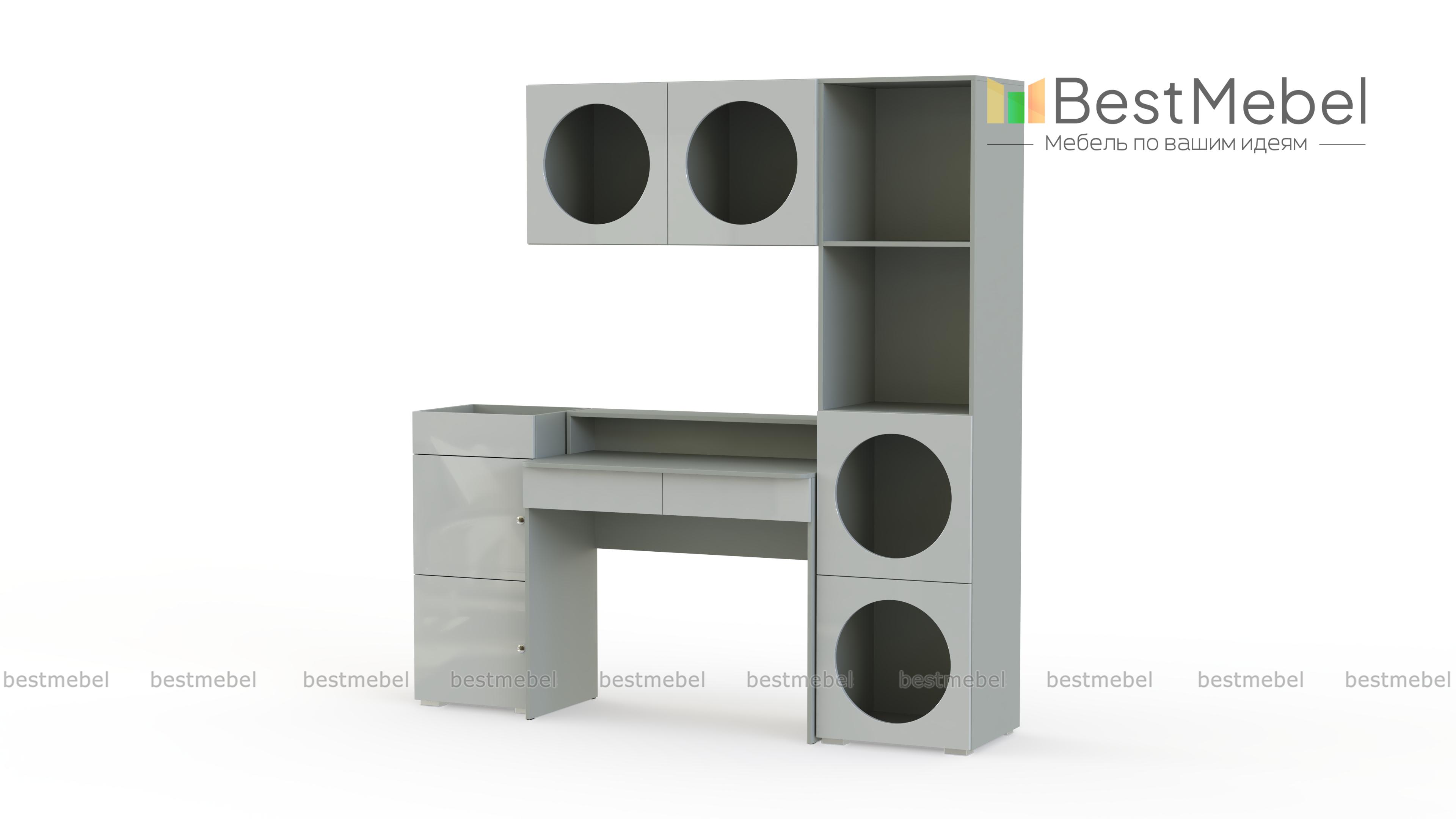 Детская стенка Авелин 4 BMS с круглыми полками поможет организовать рабочую зону в современной квартире. Больше места для хранения канцелярских принадлежностей обеспечит высокая тумба, столик дополнен нишей и ящиками, а в комплекте к стеллажу идет широкая подвесная полка. Стильную геометрию предметов подчеркивает контрастная цветовая гамма. Купить детскую стенку Авелин 4 BMS с выбором размеров, цвета и фурнитуры приглашаем на сайт нашего интернет-магазина.