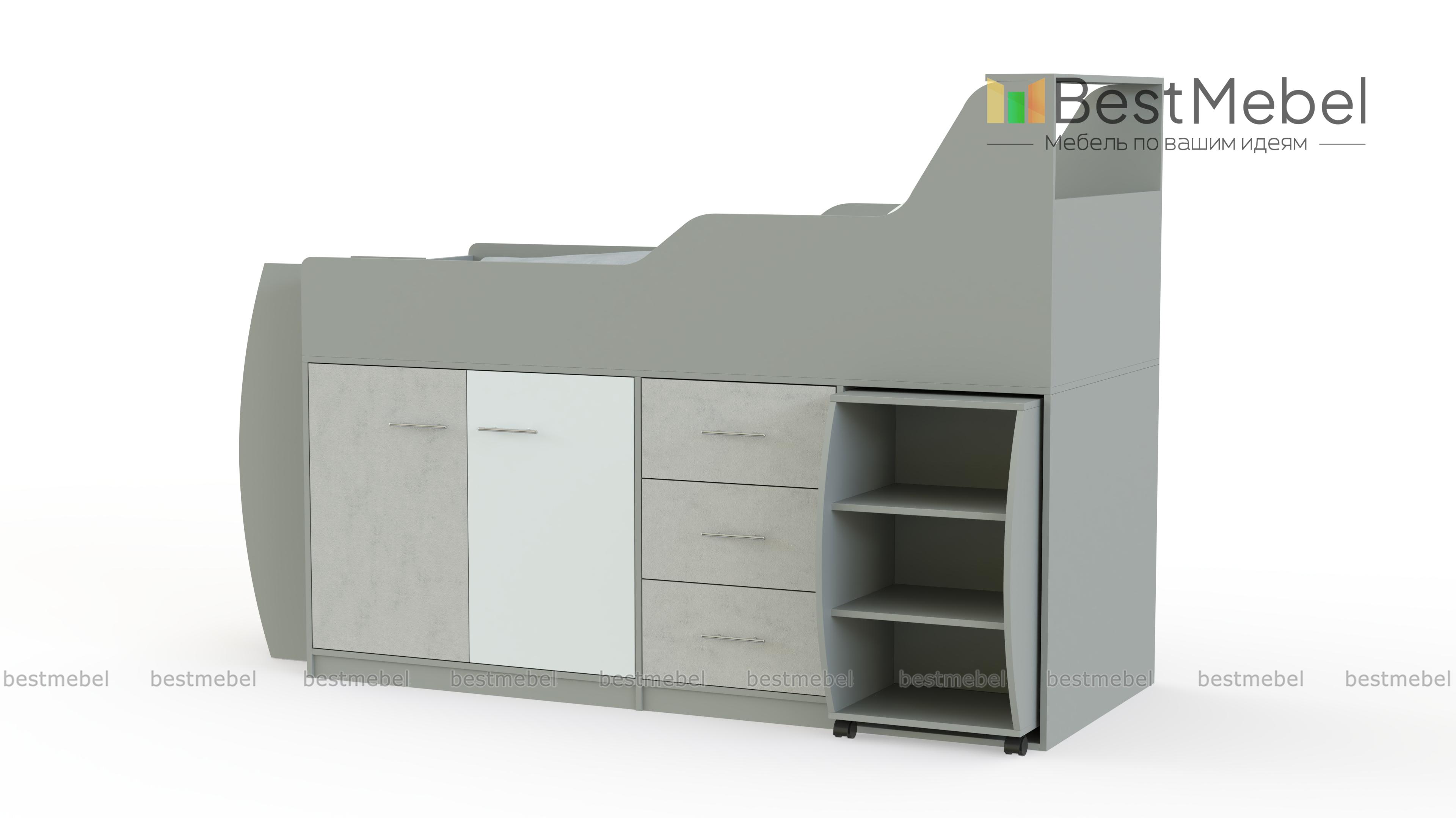 Кровать-чердак Минимакс BMS представляет собой мебельный комплекс, объединивший зону отдыха с удобной системой хранения и местом для творческих занятий. Незаменимая в малогабаритных квартирах, композиция включает в себя просторное спальное место с полкой в изголовье и защитными бортиками, устойчивую лестницу и расположенные на первом ярусе выдвижные ящики, распашное отделение и выкатной столик с мини-стеллажом. Яркий дизайн порадует ребенка и создаст в помещении комфортную атмосферу. Купить кровать-чердак Минимакс BMS приглашаем в наш интернет-магазин.