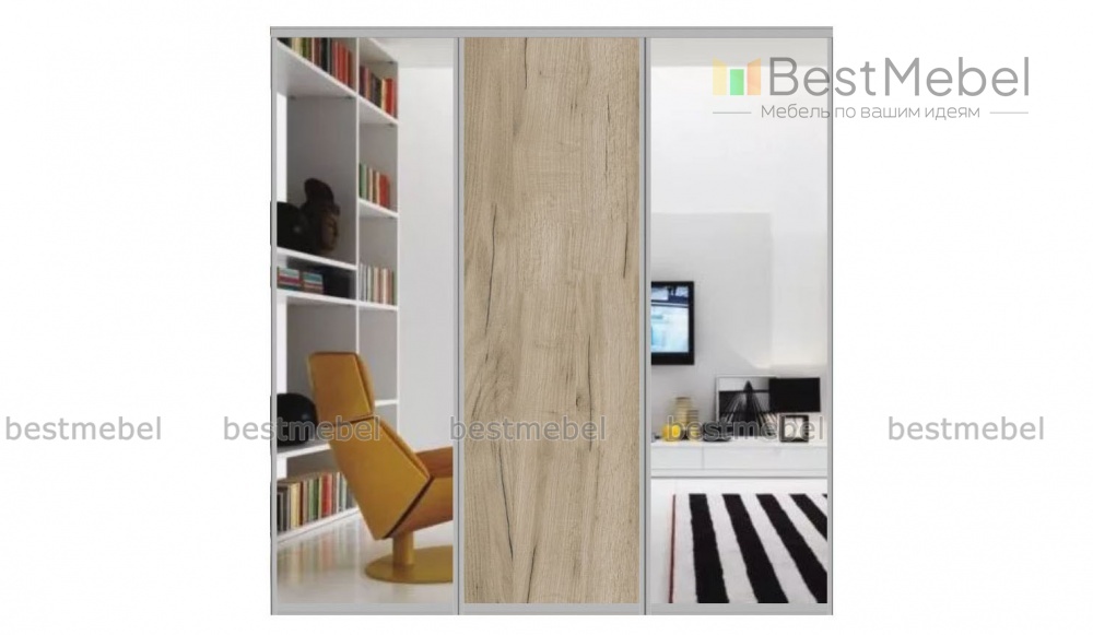 Двери-купе Черч 2 BMS помогут оборудовать гостиную, спальню или прихожую встраиваемой системой хранения. Готовый фасад состоит из трех створок – глухого полотна в крафтовых древесных тонах и двух полностью зеркальных, удобных для примерки и придающих комнате дополнительную глубину и объем. Прочные благодаря рамам из профиля, двери станут частью раздвижной системы и сохранят полезную площадь комнаты.