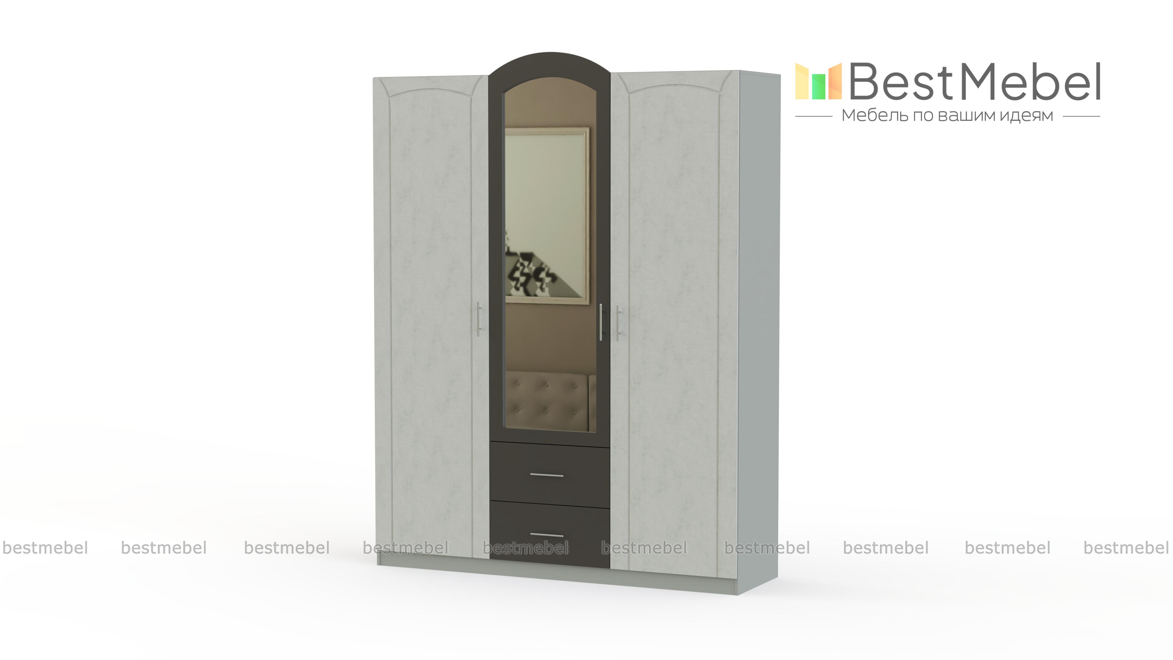 Распашной шкаф Марта 01 BMS с оригинальным декором фасада и арочной центральной створкой сразу привлекает к себе внимание. В оформлении модели скомбинированы светлые тона и графитовый, большое зеркало со скругленным верхом визуально облегчает конструкцию. Трехдверный шкаф имеет удобные средние габариты и отличается хорошей вместительностью благодаря наличию распашных отделений с полками и штангой и двух выдвижных ящиков. Купить распашной шкаф Марта 01 BMS с учетом нужных размеров приглашаем в наш интернет-магазин.
