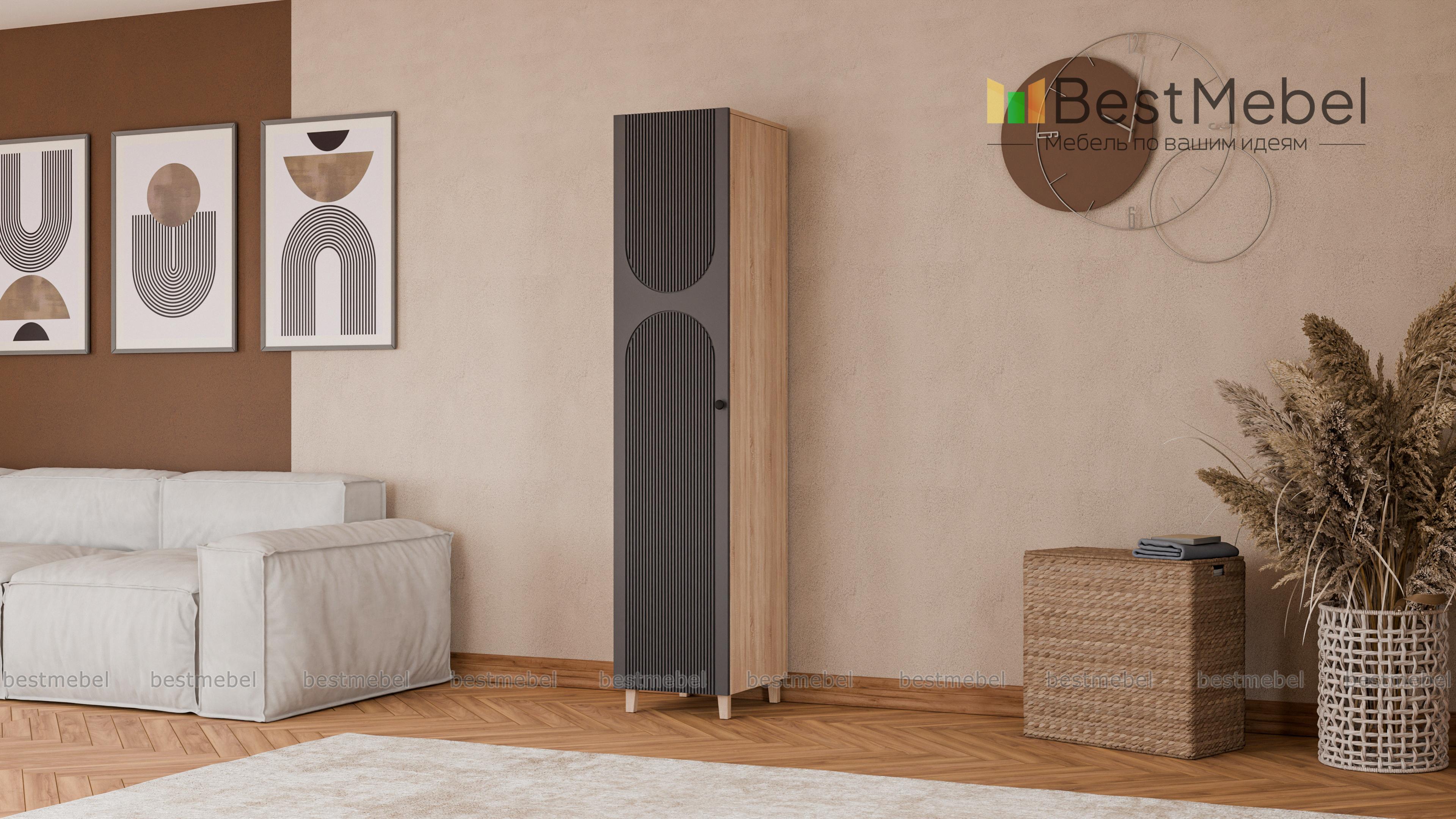 Шкаф-пенал Рене 15 BMS с высокими деревянными ножками одинаково удачно впишется в маленькую гостиную, прихожую или спальный интерьер. Компактная по ширине модель с одной распашной дверцей незаменима для хранения одежды и прочих вещей в ограниченном пространстве. Яркий акцент в интерьере — цветной фасад из плиты МДФ, украшенный стильной фрезеровкой. Купить шкаф-пенал Рене 15 BMS приглашаем в наш интернет-магазин, подобрав необходимые размеры, цвет и фурнитуру.