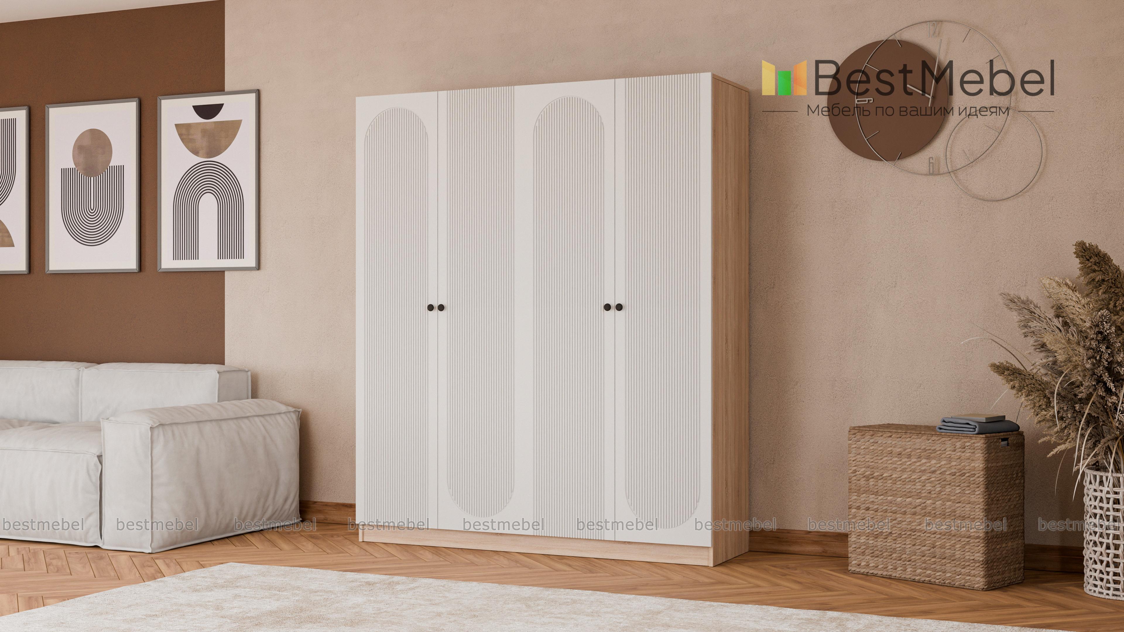 Шкаф распашной Рене 26 BMS сочетает в себе современную эстетику, функциональность и надежность конструкции. Два платяных отделения с дверцами оснащены всем необходимым для хранения одежды на вешалках и в сложенном виде. Геометрический рельеф на фасаде темного оттенка превращает этот вместительный четырехдверный гардероб в центральный элемент дизайна. Купить шкаф распашной Рене 26 BMS приглашаем в наш интернет-магазин с выбором размеров, цвета и фурнитуры.