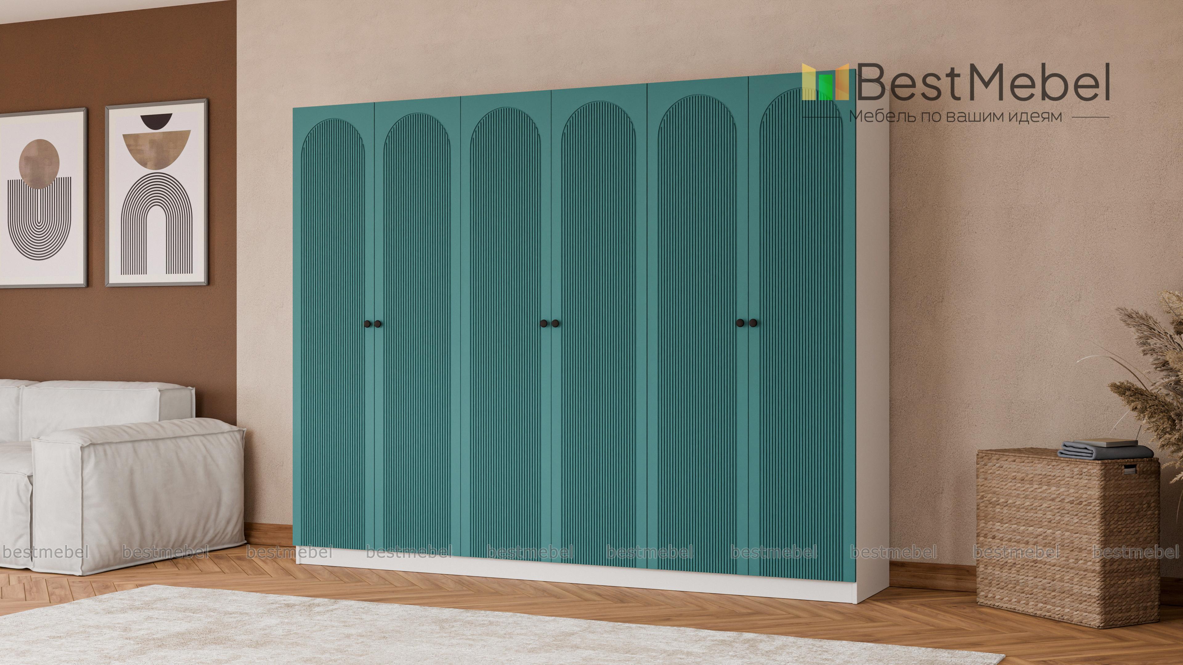 Шкаф распашной Рене 35 BMS — это отличная вместительность трех платяных отделений и современная эстетика. Фасад шестидверной модели с арочным декором и фрезеровкой красиво сочетается с корпусом в древесных тонах. Качественные материалы — ламинированная плита и МДФ, и надежная фурнитура делают пользование комфортным и долговечным. Купить шкаф распашной Рене 35 BMS вы сможете на сайте нашего интернет-магазина с изготовлением по индивидуальным размерам.