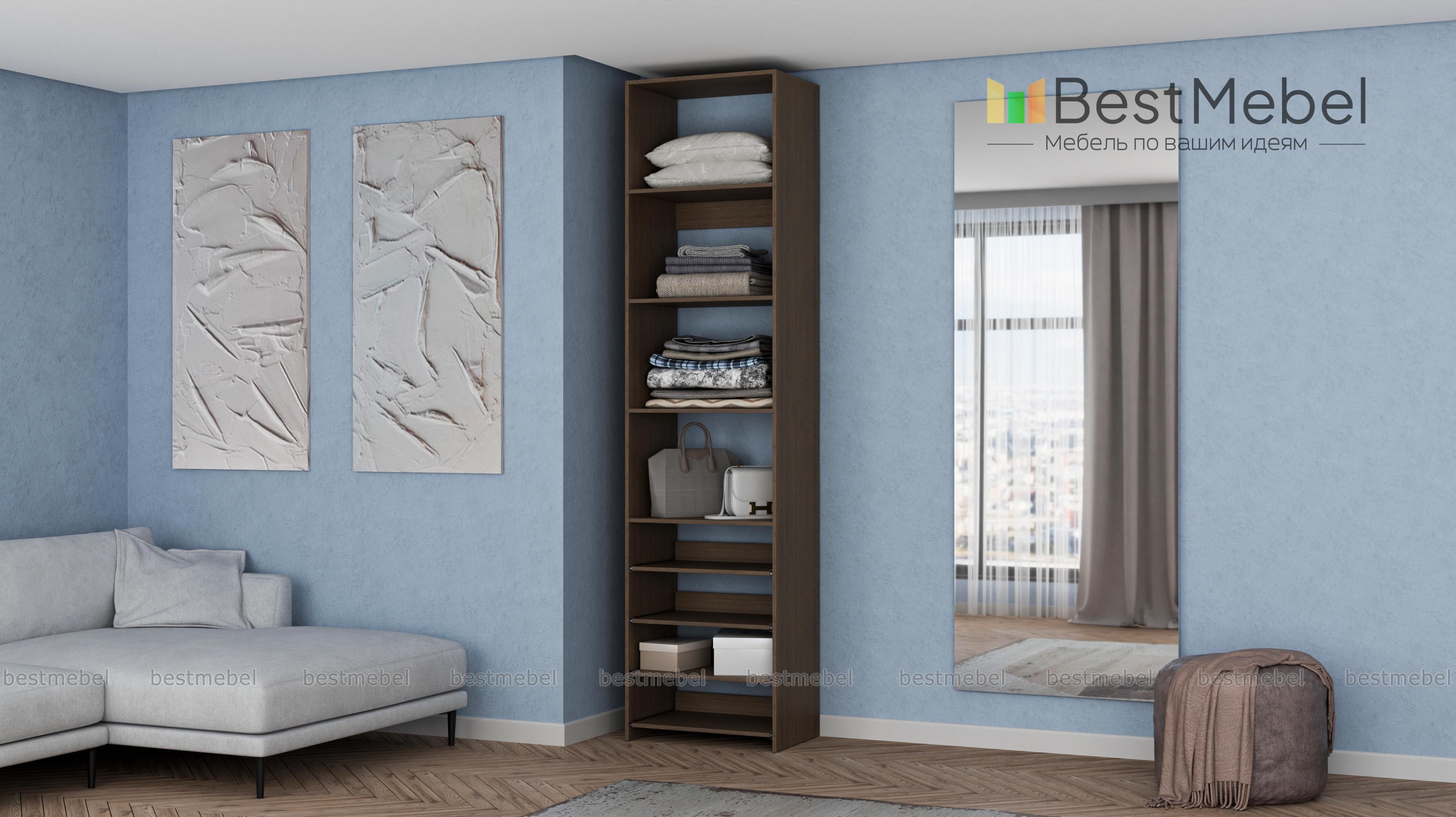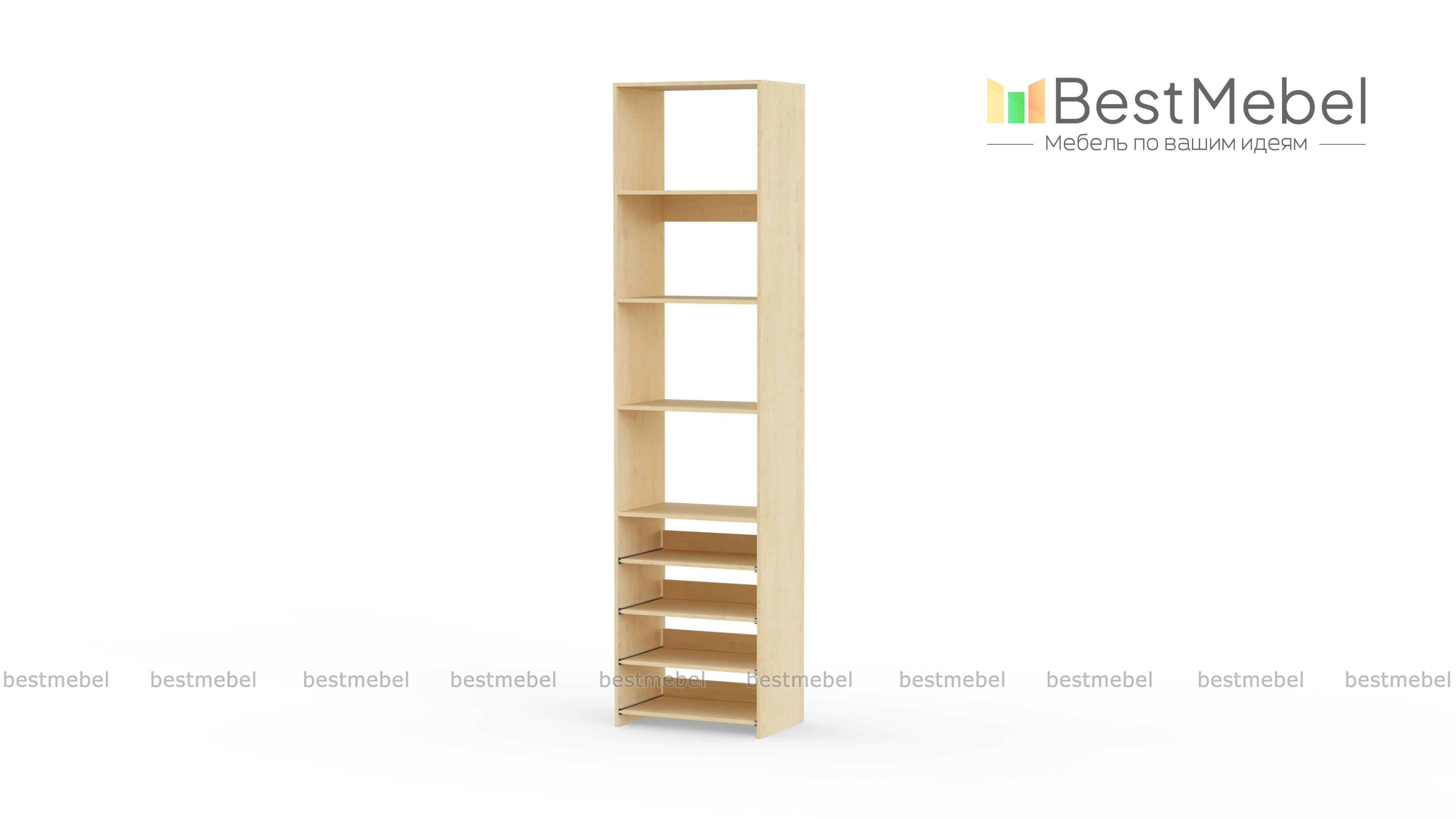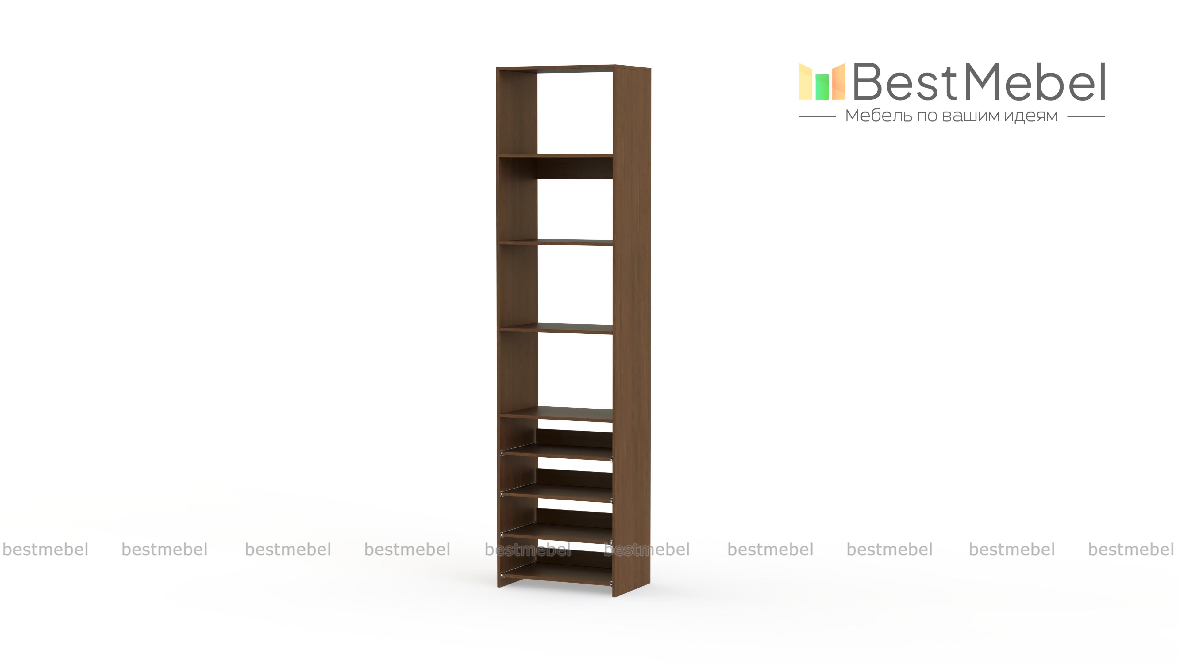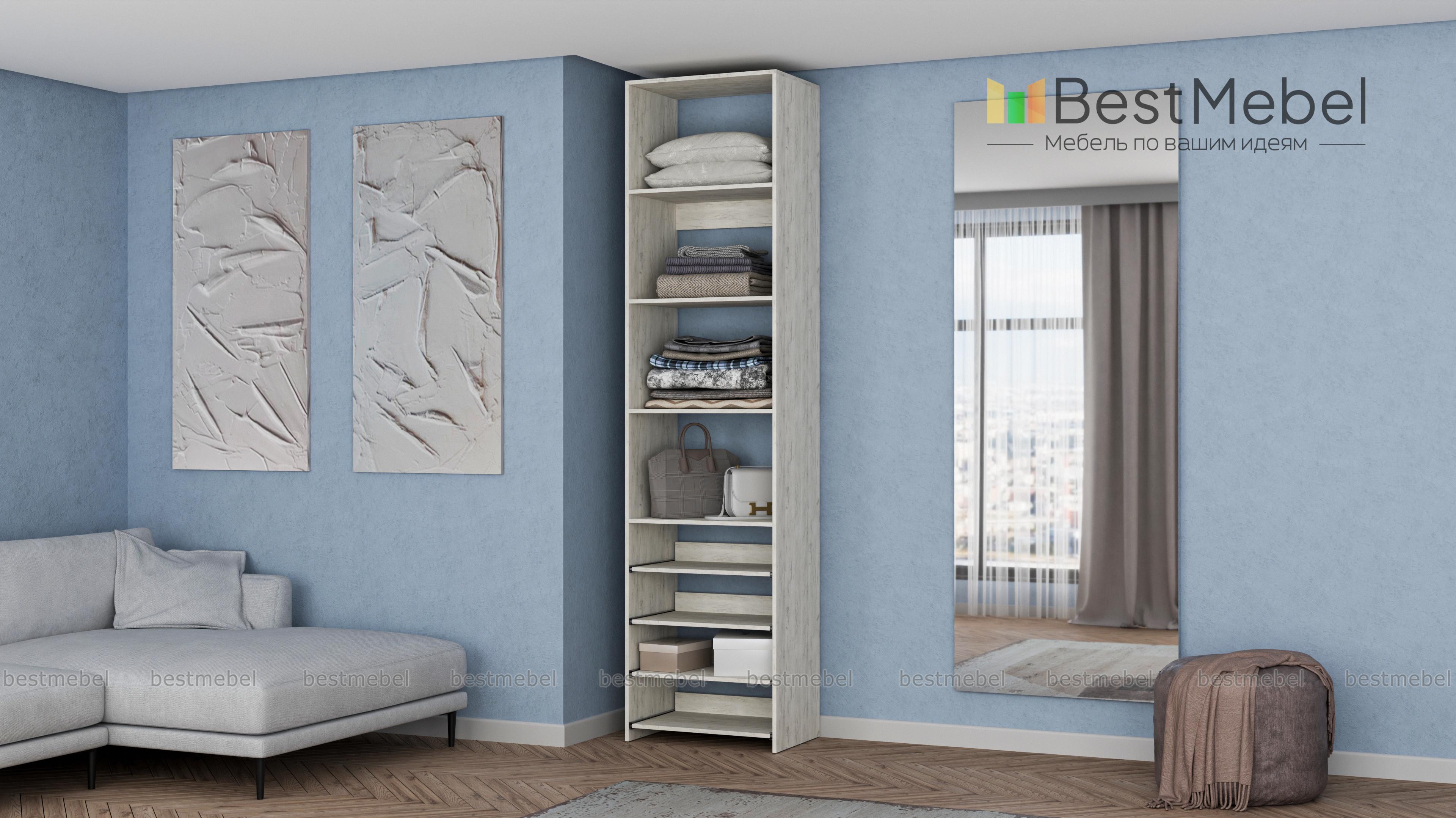 Стеллаж для одежды Мирта 74 BMS прекрасно подходит для небольшого количества вещей. В узком стеллаже, оснащенном четырьмя стандартными и четырьмя выдвижными полками можно хранить сложенную одежду, сезонную обувь и всевозможные аксессуары. Открытая конструкция обеспечивает удобный доступ к содержимому полок и упрощает уборку. Купить стеллаж для одежды Мирта 74 BMS, изготовленный по индивидуальным размерам, можно недорого на сайте нашего интернет-магазина.
