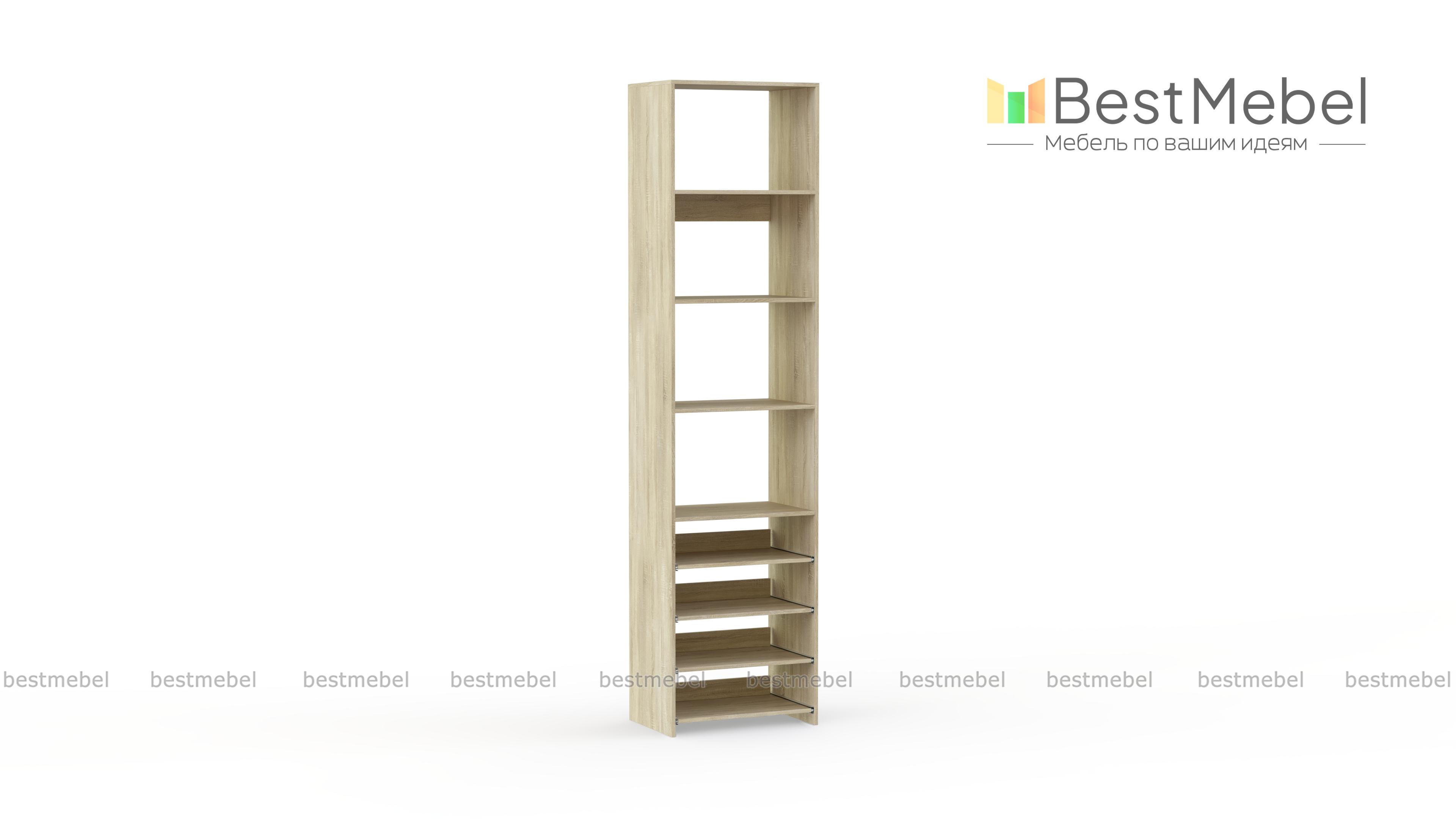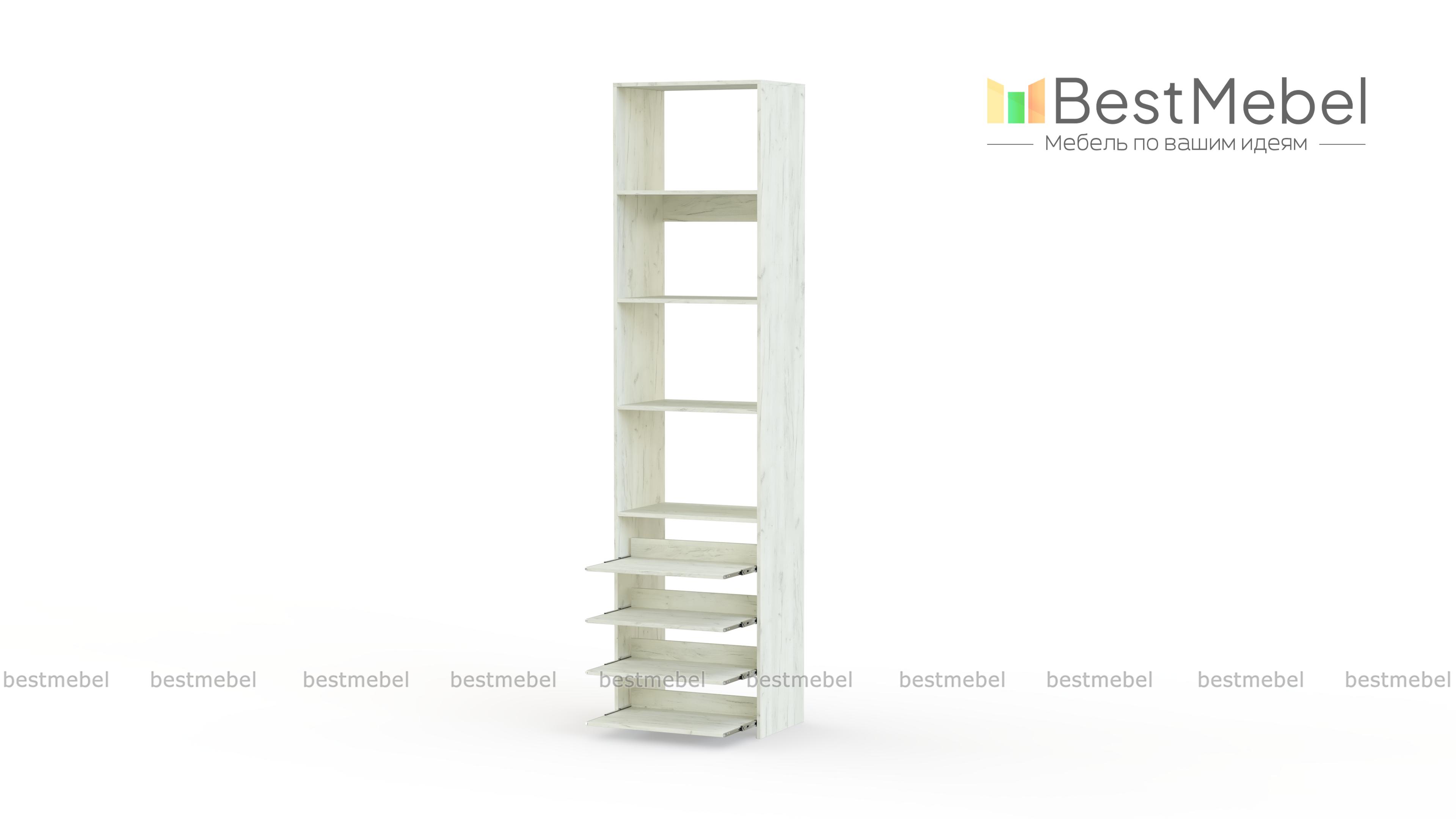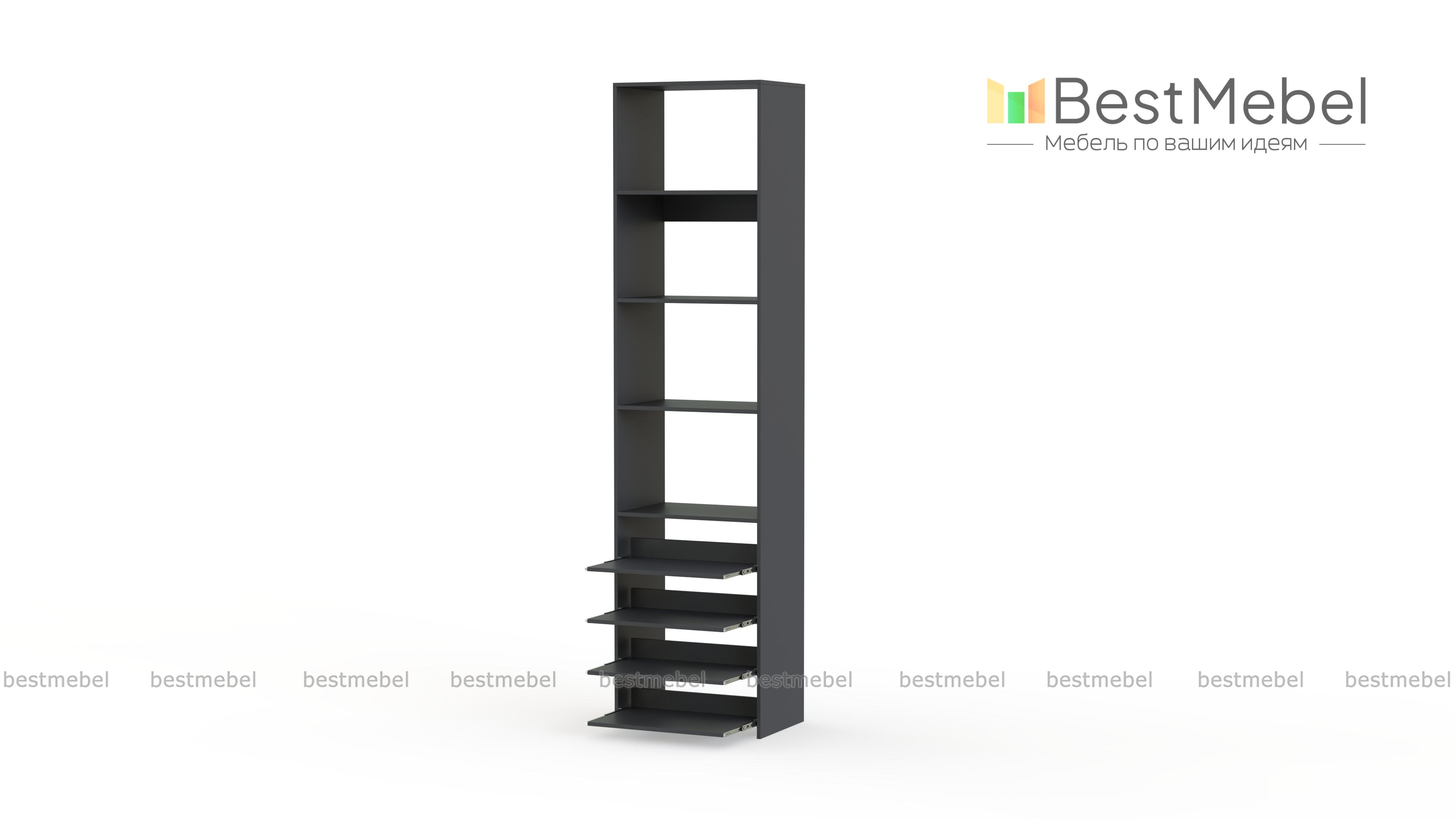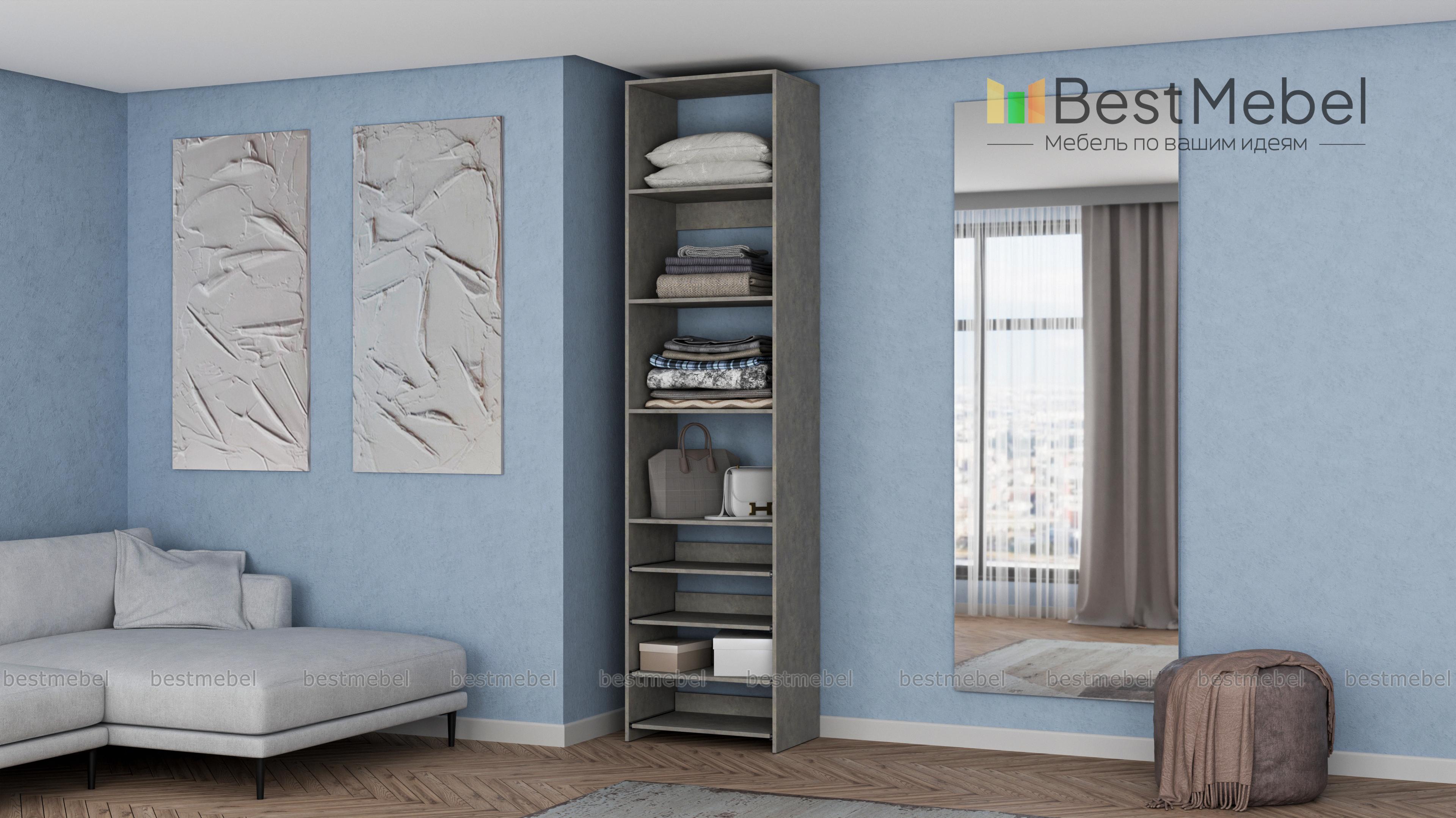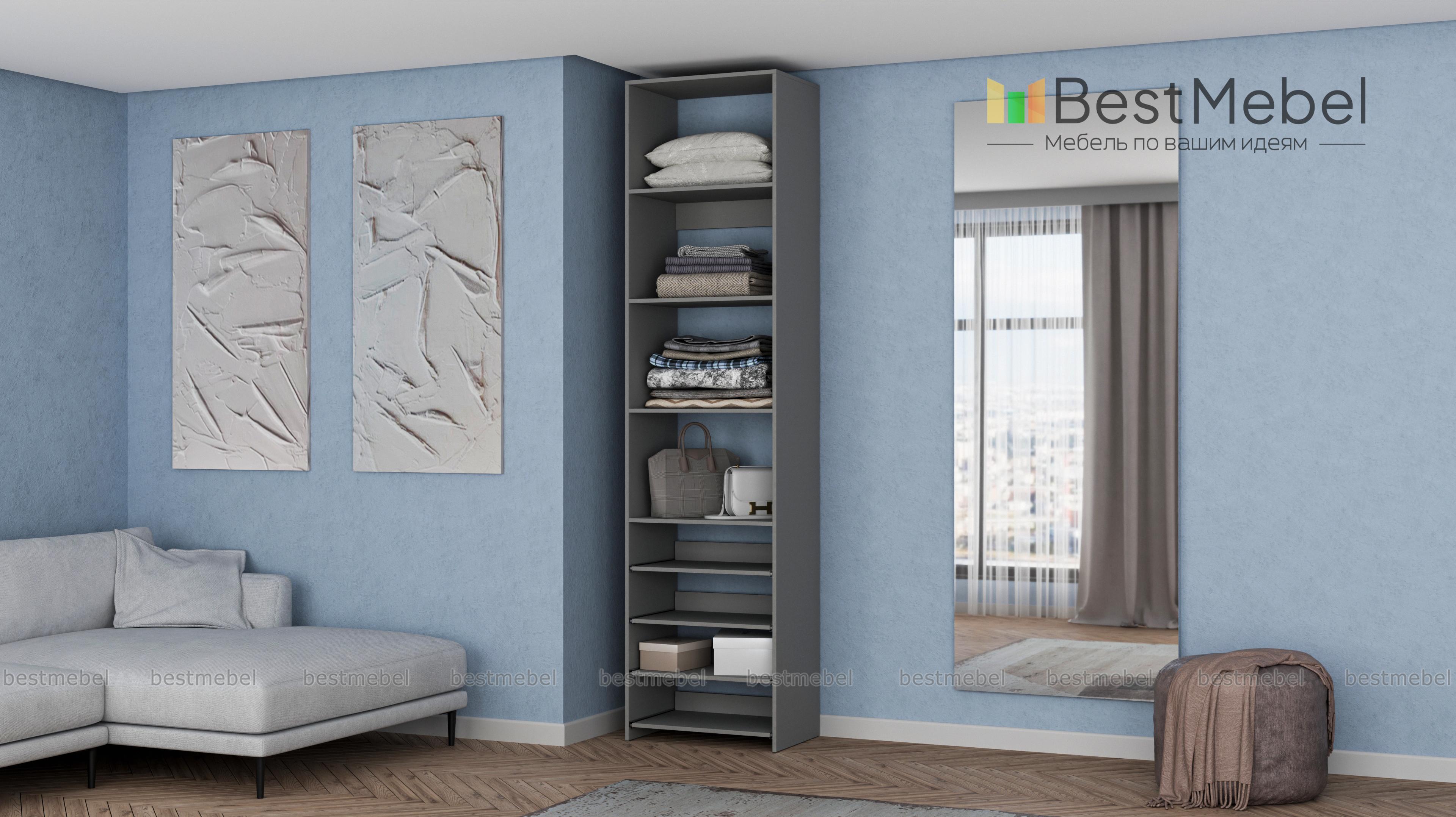 Стеллаж для одежды Мирта 74 BMS прекрасно подходит для небольшого количества вещей. В узком стеллаже, оснащенном четырьмя стандартными и четырьмя выдвижными полками можно хранить сложенную одежду, сезонную обувь и всевозможные аксессуары. Открытая конструкция обеспечивает удобный доступ к содержимому полок и упрощает уборку. Купить стеллаж для одежды Мирта 74 BMS, изготовленный по индивидуальным размерам, можно недорого на сайте нашего интернет-магазина.