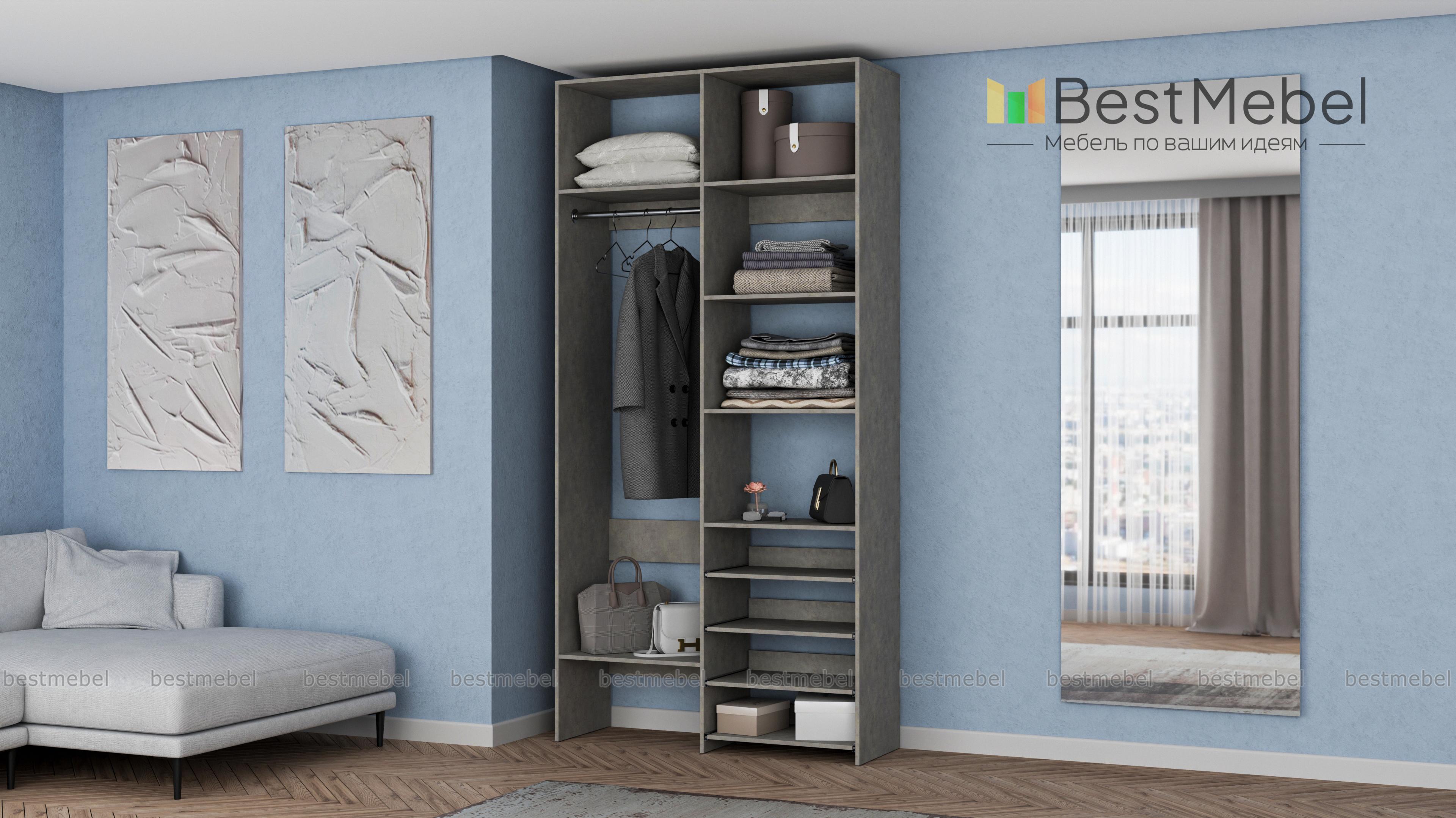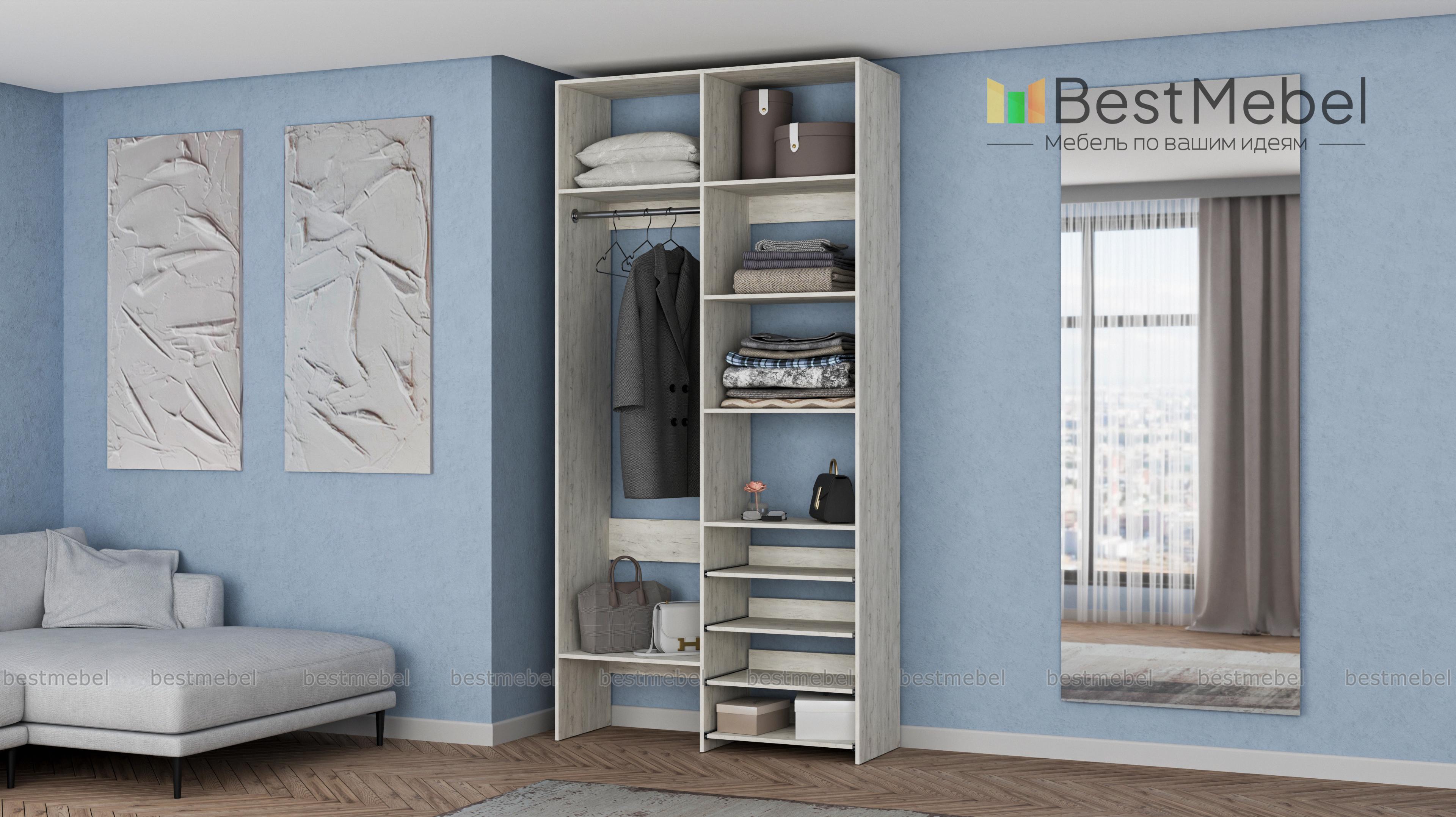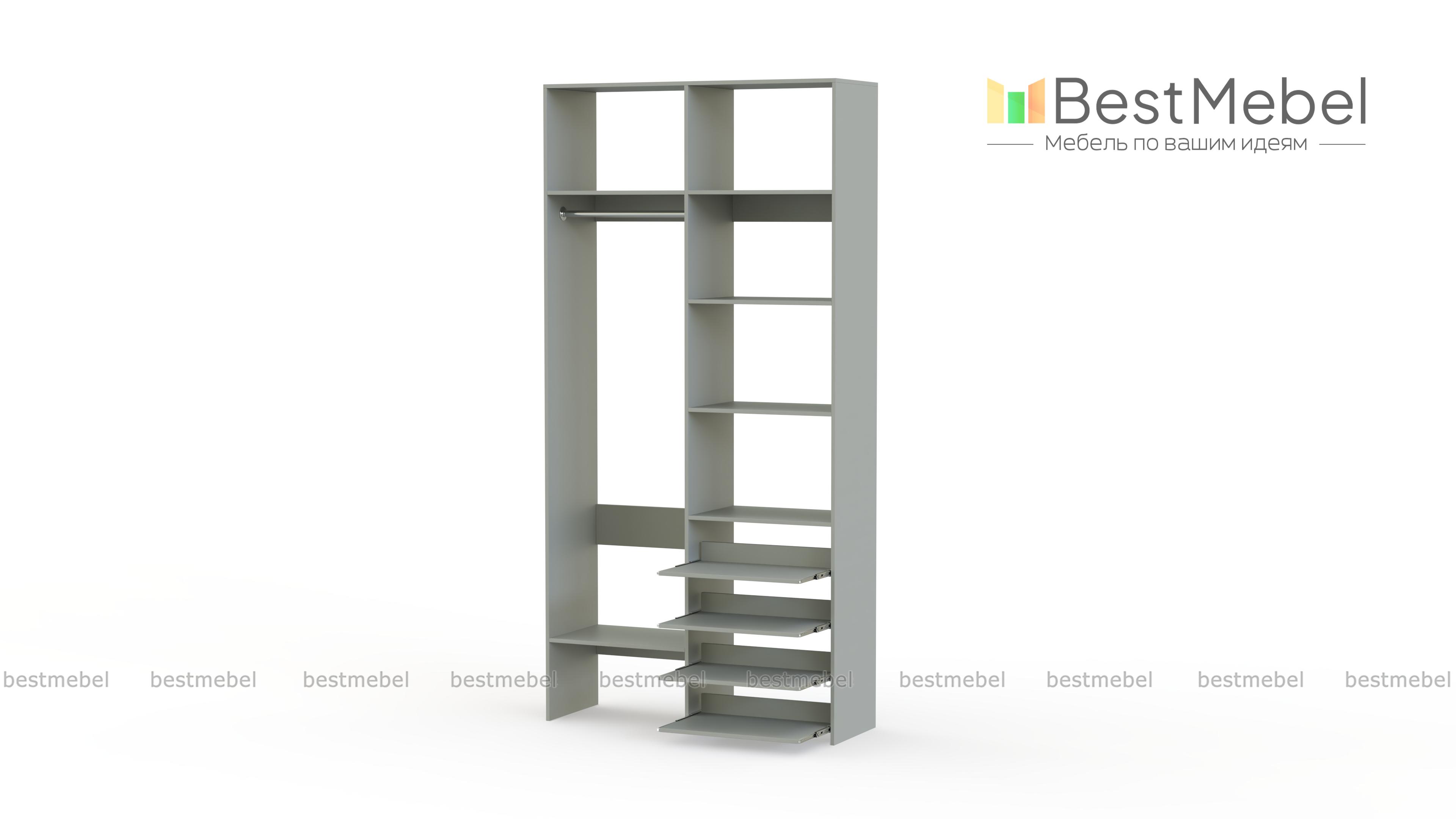 Стеллаж для одежды Мирта 79 BMS подойдет вам, если вещей немного. Компактная по ширине конструкция оборудована не только штангой для вешалок и стандартным набором бельевых полок, но и четырьмя выдвижными панелями. В нейтральном природном оттенке стеллаж выглядит современно, а простая форма хорошо вписывается в пространство. Купить стеллаж для одежды Мирта 79 BMS, изготовленный по индивидуальным размерам, вы всегда сможете на сайте нашего интернет-магазина.