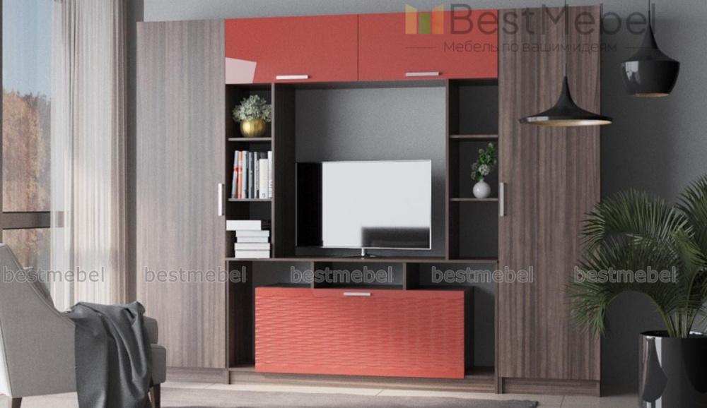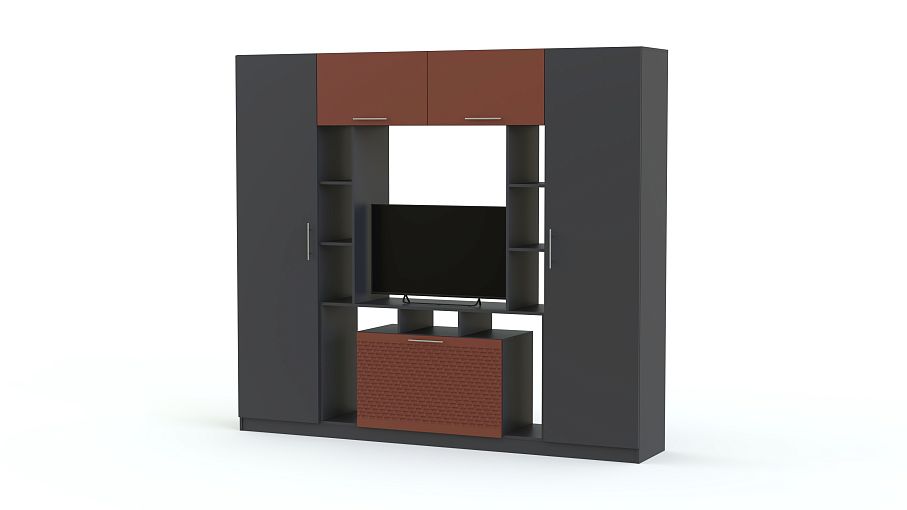 Стенка в гостиную Блеск 13.1-3D BMS станет главным акцентом в домашнем интерьере и поможет оборудовать стильную зону отдыха. Композиция удобных средних габаритов включает в себя тумбу под ТВ с нишами и стеллажами, глухие антресольные секции и два симметрично расположенных бельевых шкафа. Классические древесные тона дополнены вставками терракотового оттенка с эффектным рельефом. Купить стенку в гостиную Блеск 13.1-3D BMS по демократичной цене вы сможете в нашем интернет-магазине.