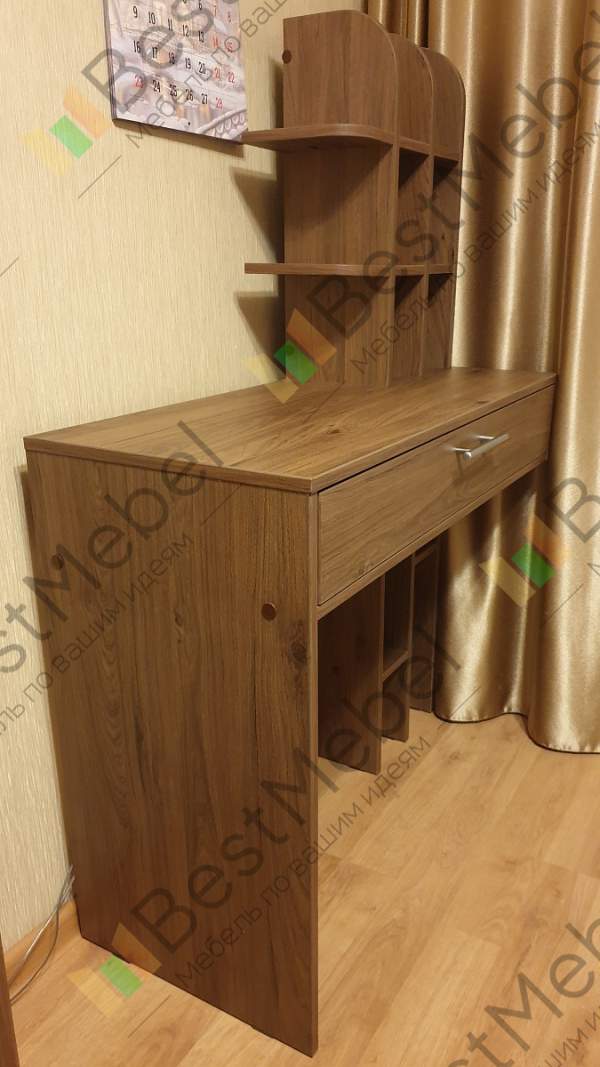 Стол хороший, требует крепления к стене и слишком громоздко смотрятся верхние полочки, их надо делать не такие глубокие, пожалела, что согласилась на усиление дна ящика(думала, что будет фанера потолще) а из ЛДСП уменьшает объём ящика. Заказ привезли в срок, все детали были пронумерованы, собрали сами без проблем