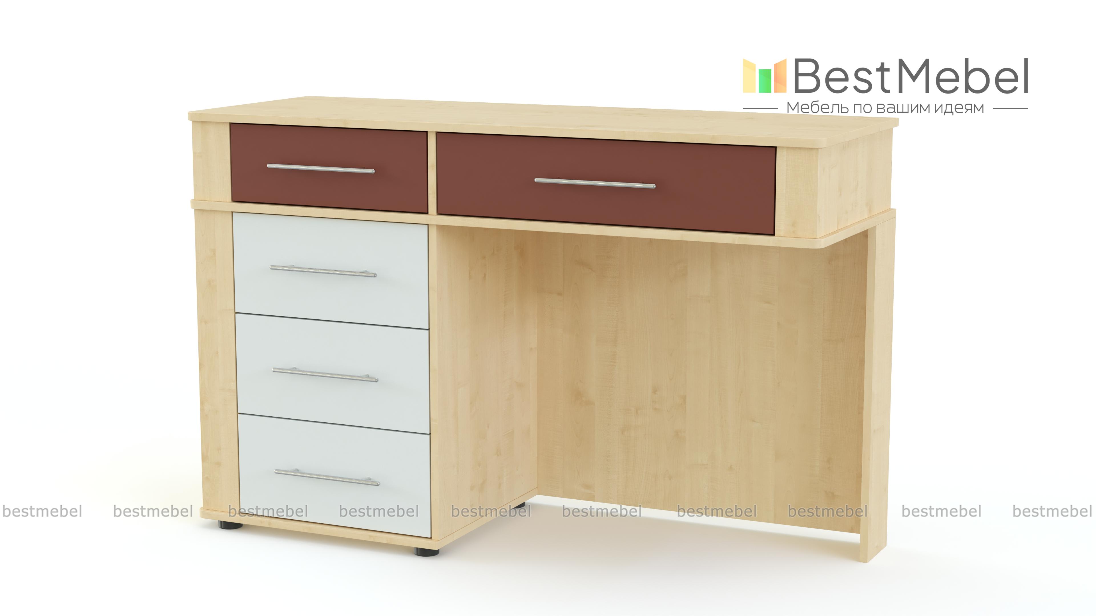 Туалетный столик Бруна BMS – это оригинальный дизайн и универсальная расцветка под массив дерева, которая гармонично впишется в большинство современных интерьеров. Модель отличается вместительностью и эргономичной формой, которые сделают уход за собой максимально комфортным. Столик оборудован просторной столешницей, двумя малыми и тремя большими выдвижными ящиками для мелочей с ручками-рейлингами, углы безопасно закруглены. Купить туалетный столик Бруна BMS для стильной и уютной спальни приглашаем по лучшей цене в наш интернет-магазин.