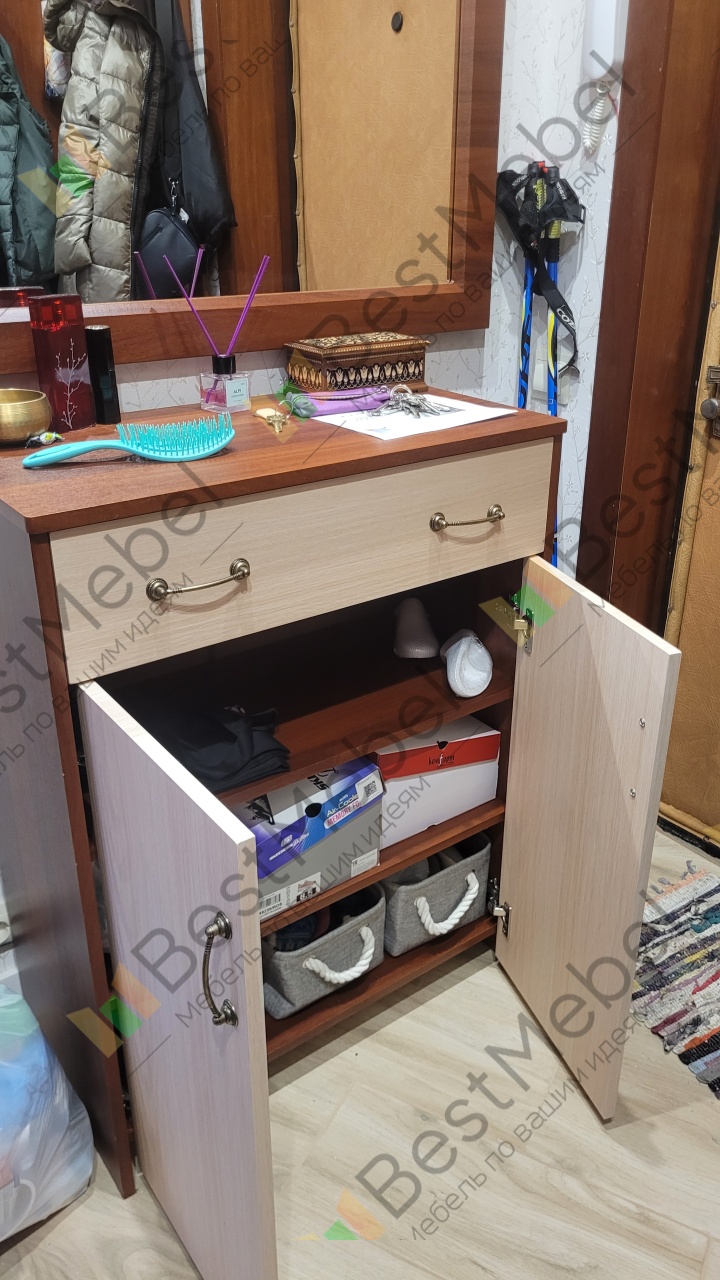 Заказ 00000107416, изделие ЭСКИЗ №00000107416 Тумба для белья Тимини 2 BMS (710х920х370).Тумба на основе Тимини 2 BMS заказывалась по индивидуальным размерам и материалам. Не для белья, а как обувная. За год своей службы она пережила два переезда и осталась в идеальном состоянии. Очень крепкая, функциональная, стильная. Покупалась вместе с зеркалом в таком же цветовом исполнении.